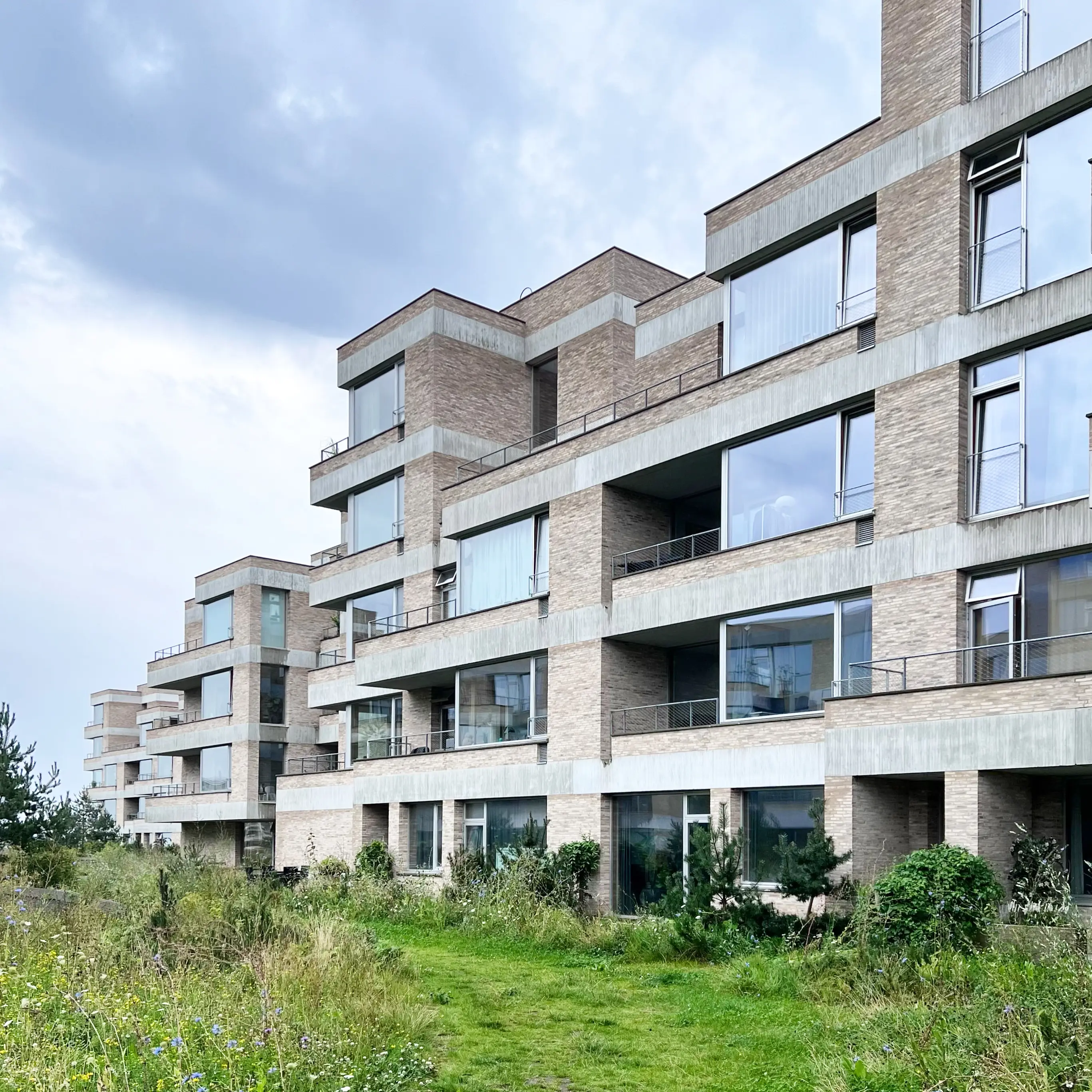 No fences or gates, landscape flows seamlessly up and over podium car park, no ‘look-but-don’t-touch’ manicured lawns or box hedges. No hard paving. This is urban housing where natural landscape is allowed to flow around and through. And by the way look at the size of those windows!