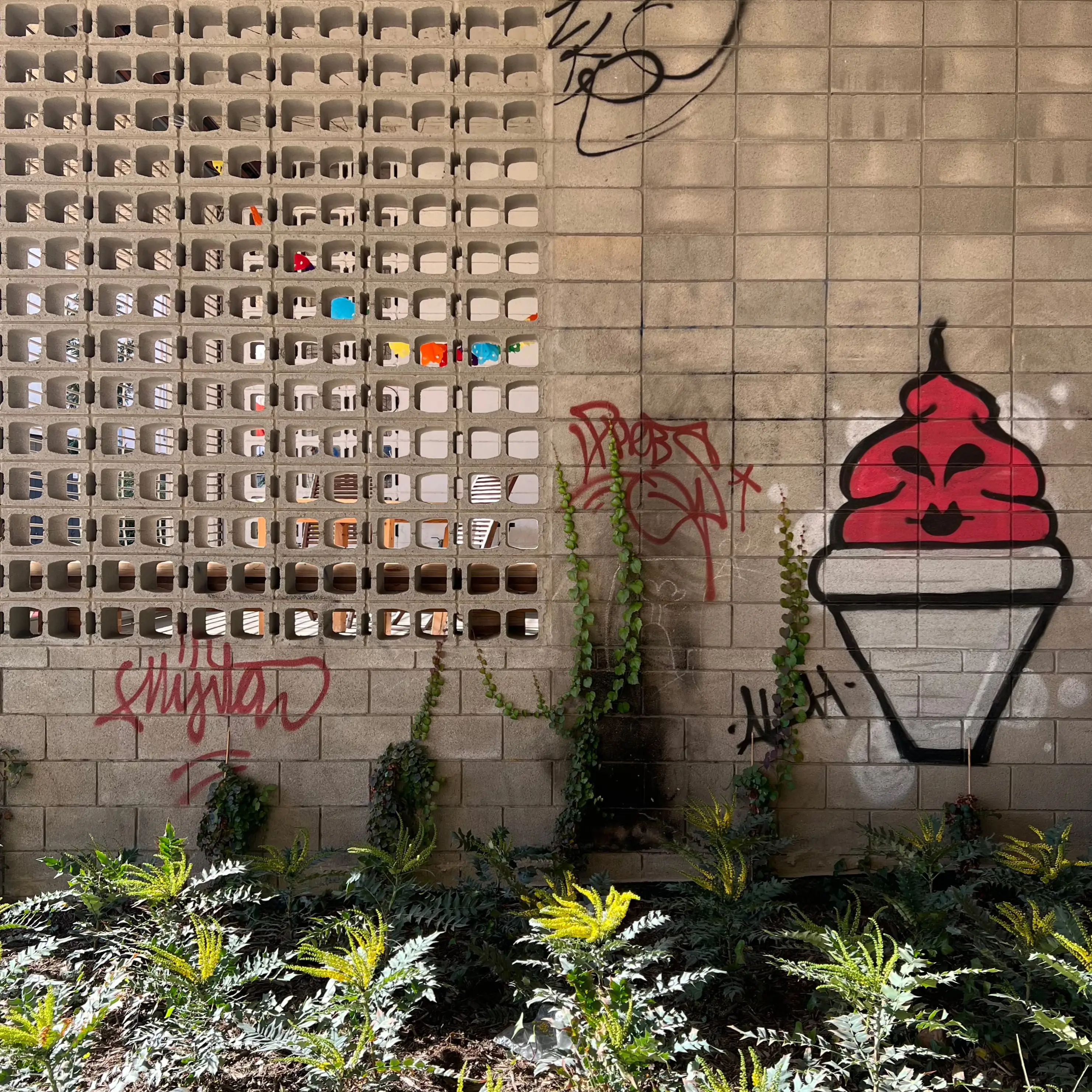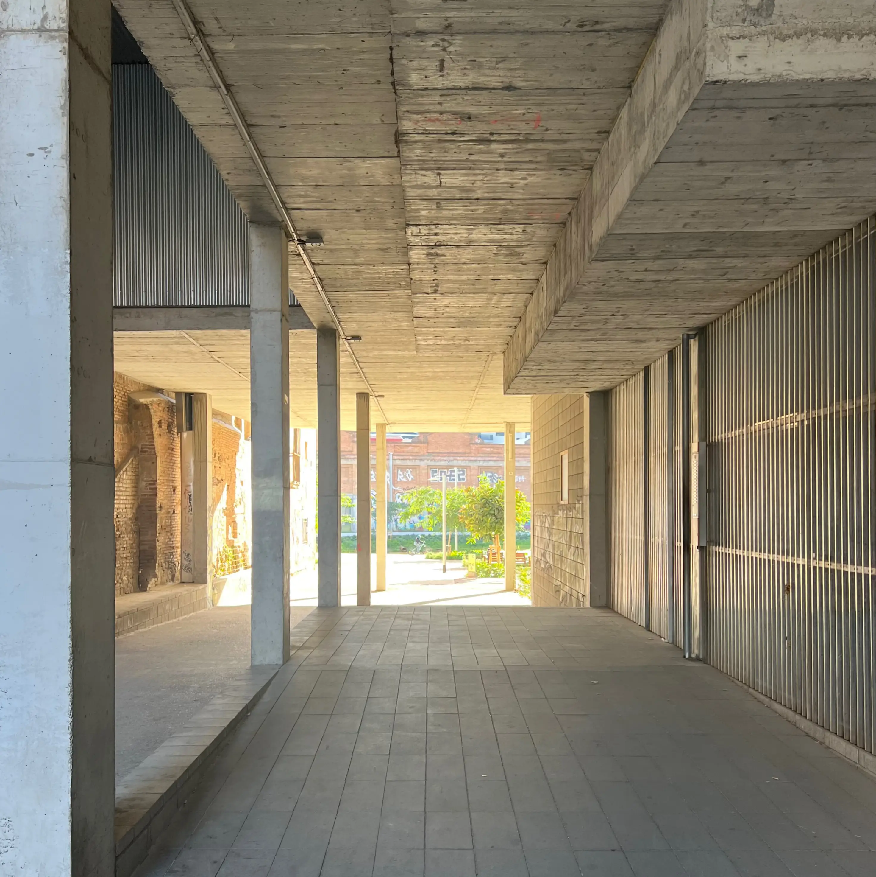 The materials used are modest, humble and honest - a bit rough around the edges, not too precious - corrugated metal (I love the little eyebrow canopies above the shop), corrugated plastic, fair face concrete and concrete blocks, and timber. It makes no concession to ‘context’ or style and feels like a place that you could call home. It’s simple, honest, rational, modern design that is even robust enough to take a bit of graffiti here and there. In the route through to the park you can see the building’s timber columns - the building is constructed from cross laminated timber (naturally) to reduce its weight and embodied carbon.