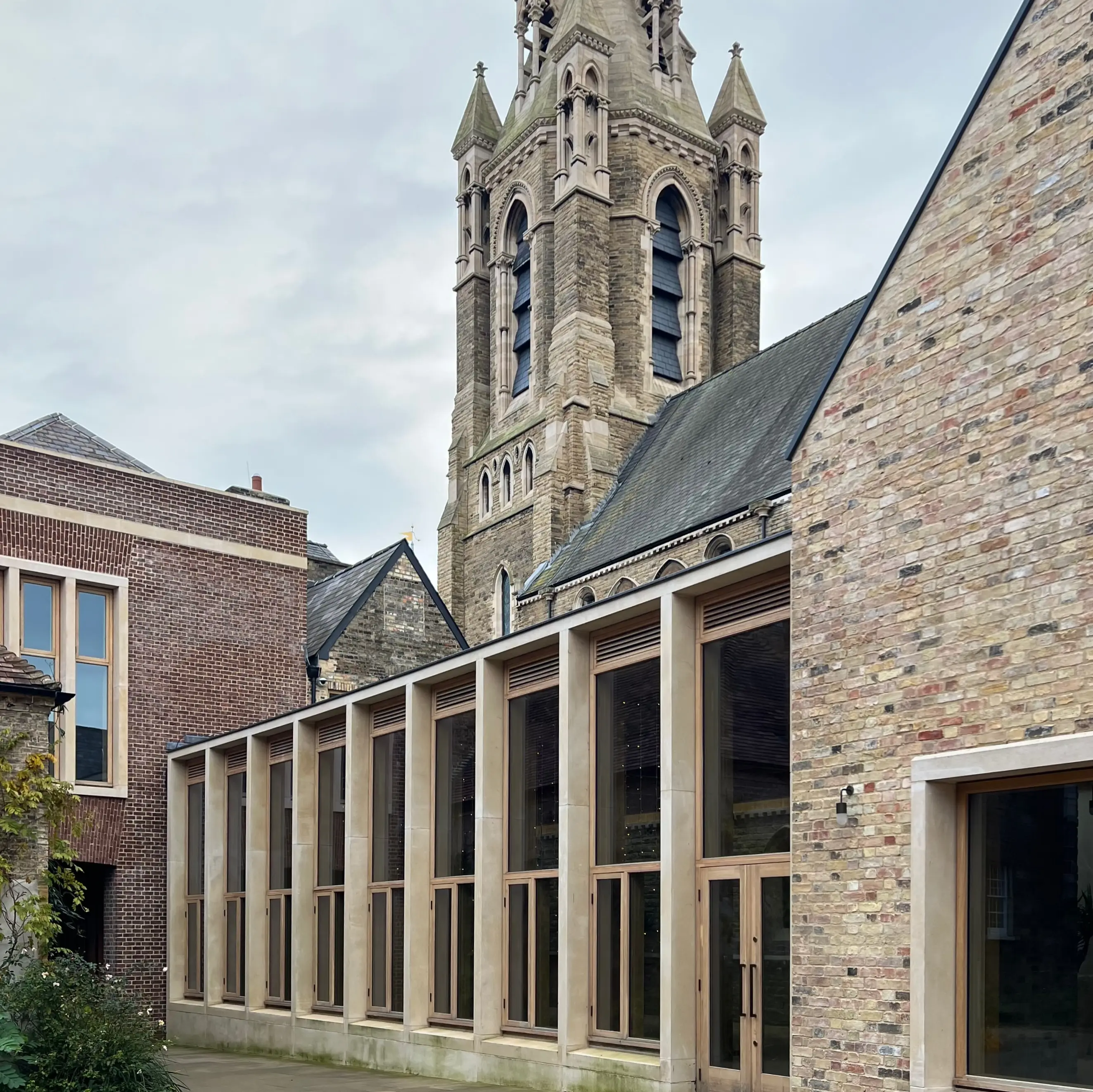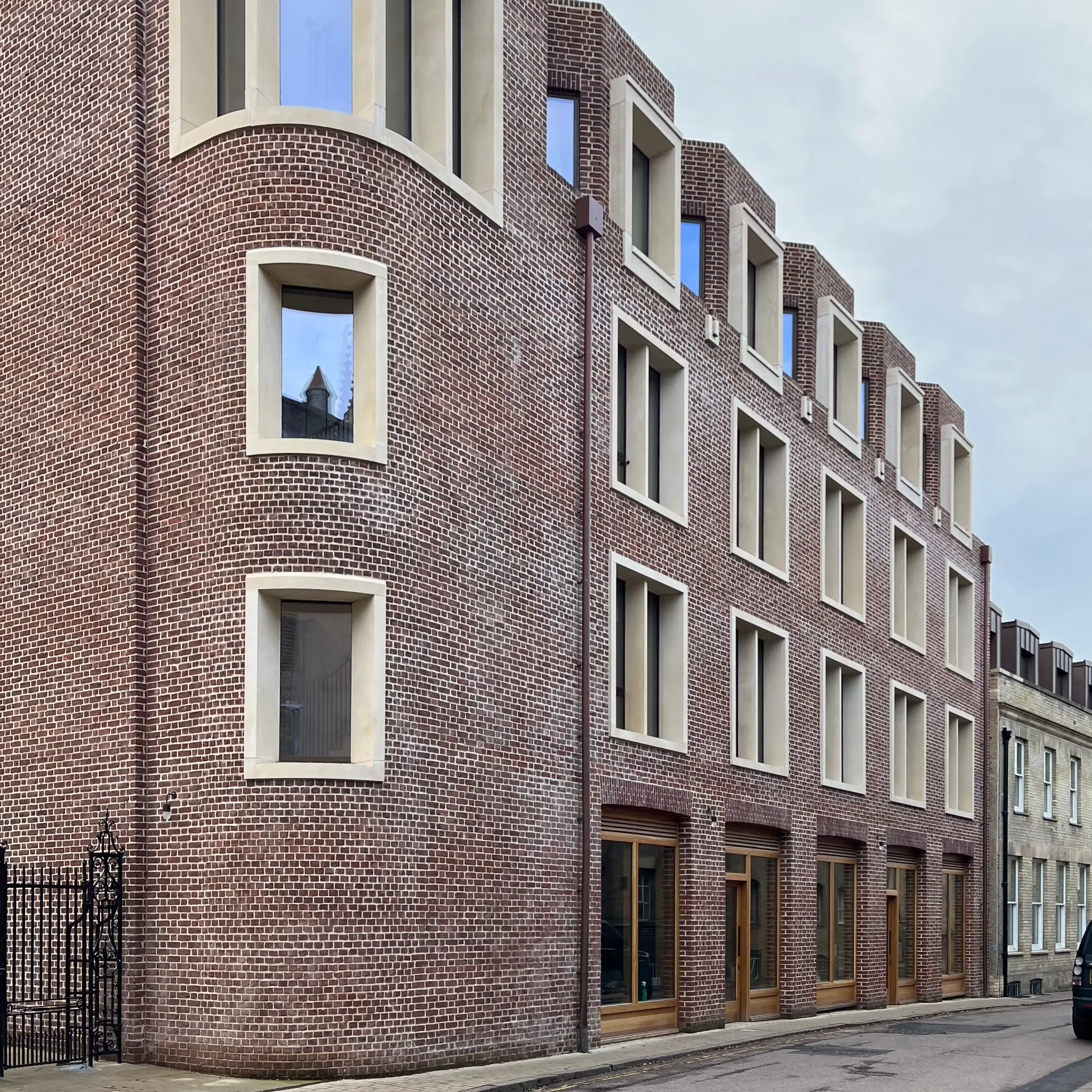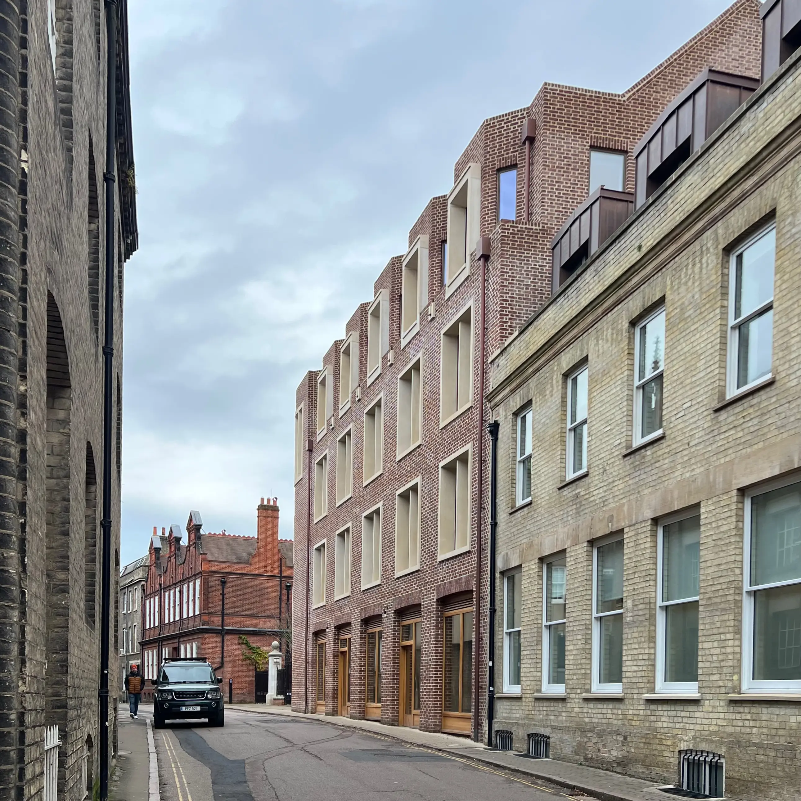 The street is Mill Lane in Cambridge. The building is an addition to Pembroke College by Haworth Tompkins; one of a collection of buildings by them that provides a new entrance to the college along with new buildings focused around a series of courtyards and gardens.