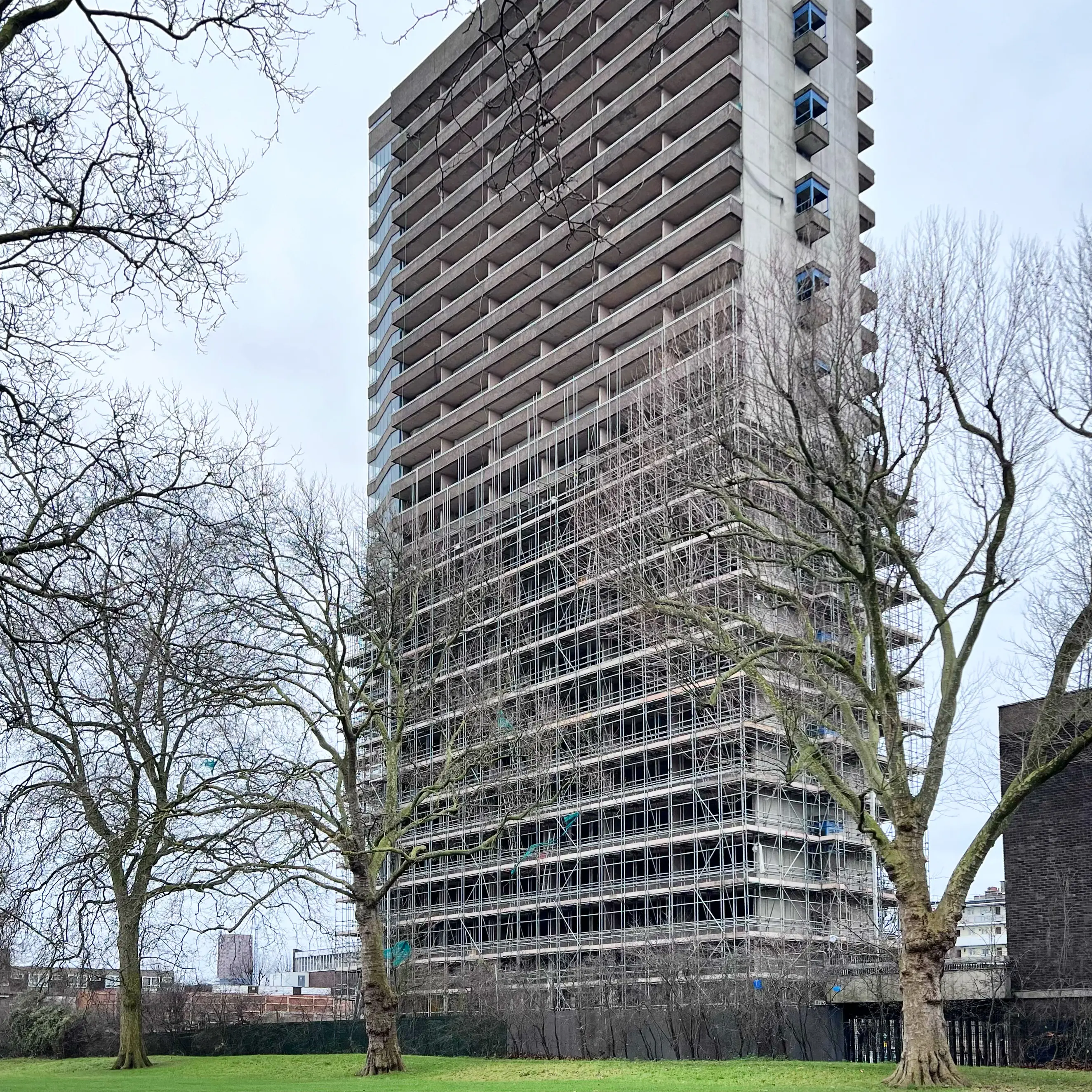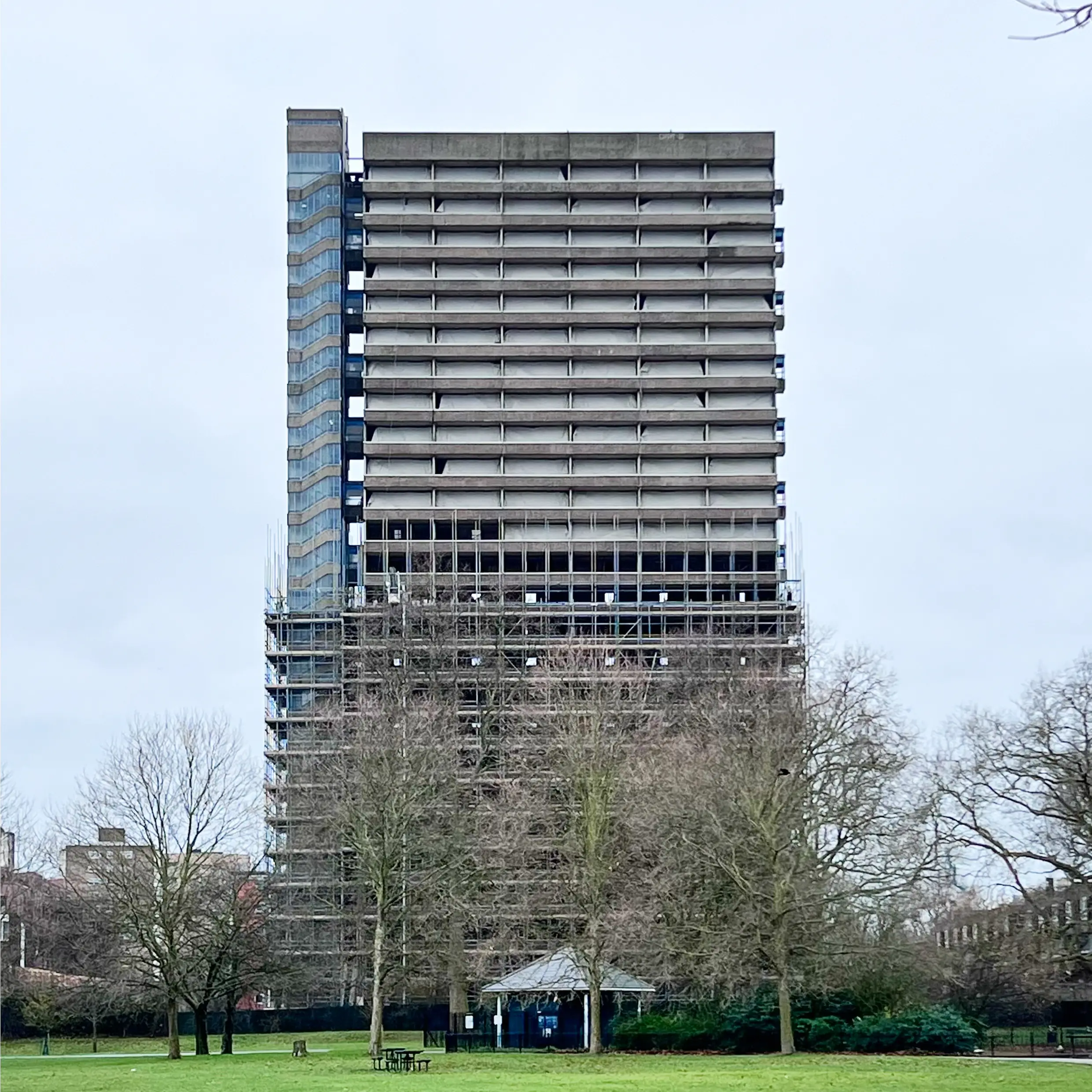 The 26 storeys of Maydew House loom over Southwark Park. It’s a building I’ve walked past frequently over the past decade or so. It’s not an iconic post-war building, but it does have a certain quality with crisp, heavily-scored horizontal balconies and a similarly crisp (not exactly Trellick Tower, but not bad) stair core clinging to the side.